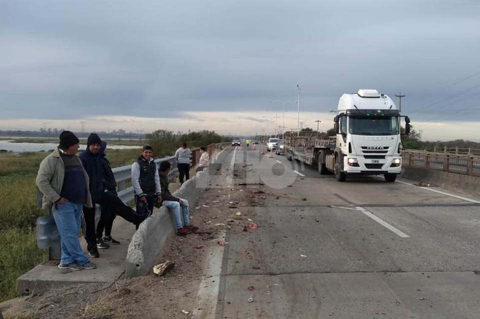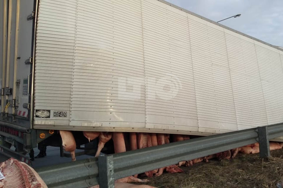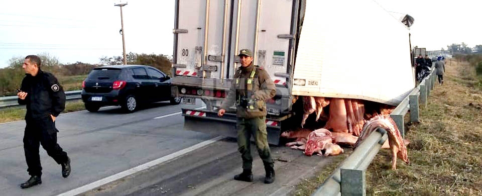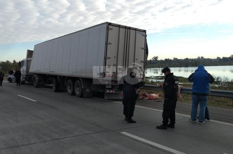 "Escuché un fuerte estruendo y cuándo miro por el espejo veo que perdía parte de la carga", dijo el chofer a los micrófonos de LT10. Por otro lado el conductor confirmó que llevaba 450 medias reses y que la carga pertenece a un importante frigorífico porcino de la ciudad.