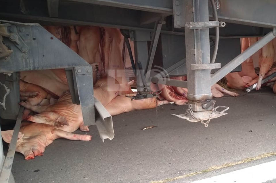 Un camión que trasladaba cerdos faeneados perdió parte de su carga tras desfondarse el acomplado en la Ruta 168 a la altura del supermercado Macro. Según se pudo saber, el convoy se trasladaba desde Maria Luisa, Entre Ríos a la ciudad de Santa Fe y por causas que se desconocen perdió parte de la mercaderia tras sufrir un desperfecto en el piso del acoplado del vehículo.