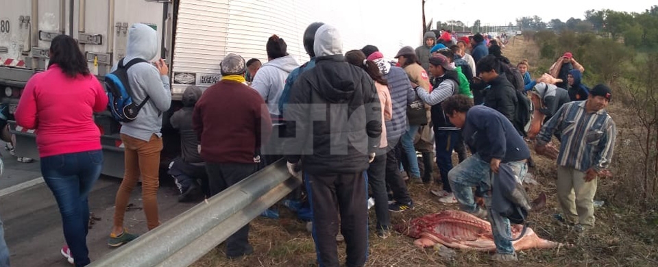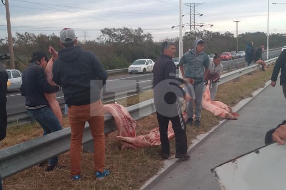 Un camión que trasladaba 20 mil kilos de carne, (unas 450 medias reses), se desfondó cuando se trasladaba por la Ruta 168 a la altura del cruce con la Ruta 1 en el ingreso a esta ciudad. Tras el hecho, cientos de personas se acercaron al lugar para tratar de llevarse parte de la carne que se encontraba debajo del convoy y tirada en la banquina.