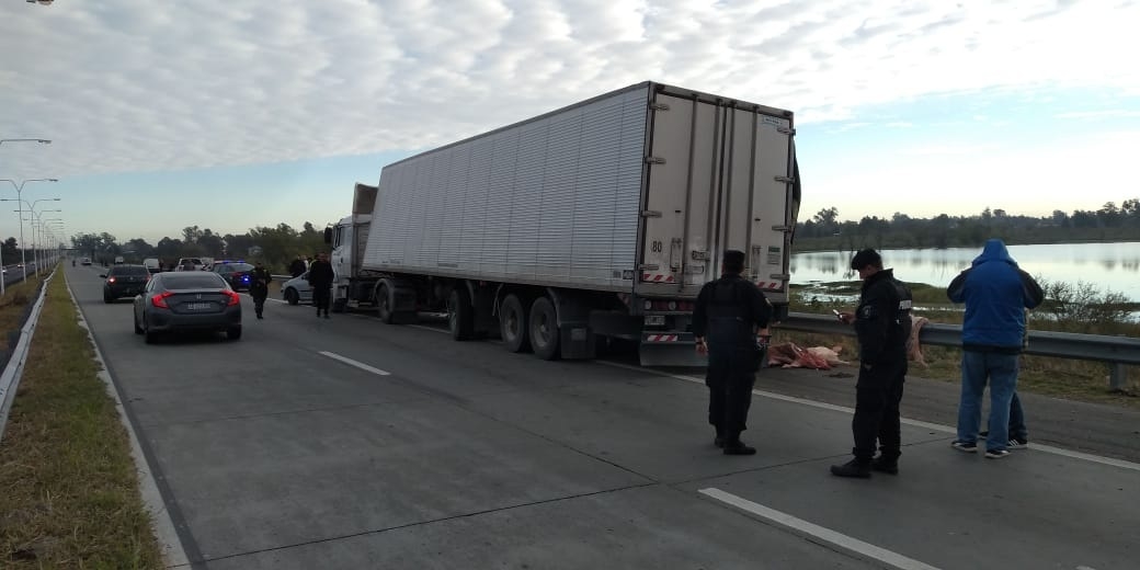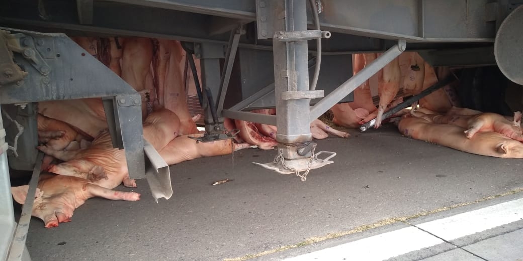 El hecho ocurrió en la mañana de este jueves cuando un camión que partió desde María Luisa, Entre Ríos, perteneciente a un reconocido frigorífico local, y su destino era la ciudad de Santa Fe sufrió un desperfecto en el acomplado y perdió parte de la mercadería que trasladaba. El piso del rodado cedió y las medias reses de cerdos cayeron sobre el asfalto lo que produjo que el camionero tenga que detener automáticamente la marcha.