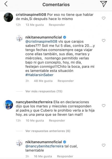 “¿Vos qué carajos sabés? Sola me fui cinco días contra 20, y tengo fechas como siempre para viajar con ellas también. Sus días, martes y miércoles, no tengo permitido verlas bajo ningún concepto. Hoy, mi día, festejan conmigo. Chito la boca. Para mi es lamentable esta situación”, escribió en su cuenta de Instagram en respuesta a un reclamo en la que la acusaban de “hacer lo mismo” que Cubero y Viciconte.