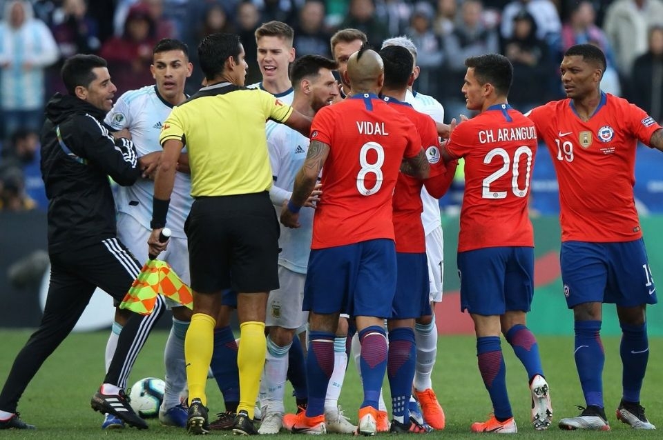 Cuando se jugaban 36 minutos de esa primera parte, el árbitro paraguayo Mario Díaz de Vivar expulsó a los dos capitanes, Lionel Messi y Gary Medel, en una jugada polémica. En esa acción, ambos se cruzaron al disputar una pelota sobre el fondo de la cancha en zona defensiva de Chile, Medel, que estuvo nervioso desde el inicio del partido, pecheó dos veces a la Pulga y amagó a pegarle un cabezazo, mientras que el argentino se mantuvo firme ante la provocación, sin replicarla. Sin embargo, Díaz de Vivar decidió mostrarles la tarjeta roja a los dos.