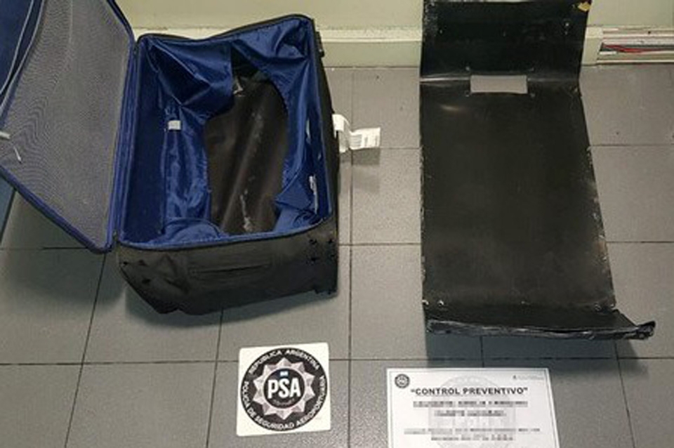 Luego de hacerse presente la propietaria del equipaje, mayor de edad, se trasladaron a otro sector donde se mantuvo comunicación con la judicatura actuante, quien ordenó requisar a la pasajera y sus pertenencias. Como resultado se halló dentro del equipaje un doble fondo que contenía una plancha de goma eva color negro impregnada que, sometida a reactivo químico para clorhidrato de cocaína, dio positivo, arrojando un peso total de 2.910 gramos.