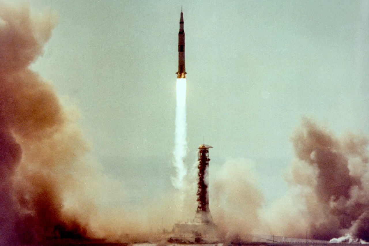 Momento del despegue del cohete Saturno V en la misión espacial Apolo 11 desde la base de Cabo Cañaveral, Florida, el 16 de julio de 1969.​