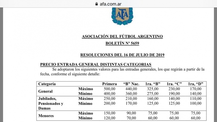 A partir del próximo torneo, luego de ser oficializado el dato en el Boletín de AFA, la entrada general de los partidos de Superliga pasará a tener un techo de 500 pesos, los de Primera Nacional (la antigua B Nacional) estarán en 440 y en la Primera B se deberá abonar hasta 325 pesos.