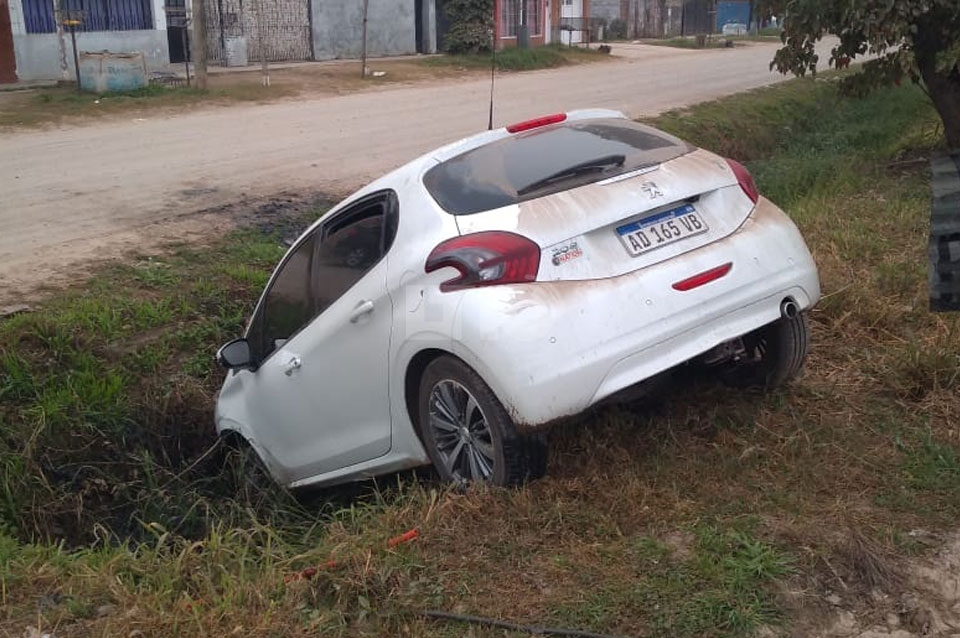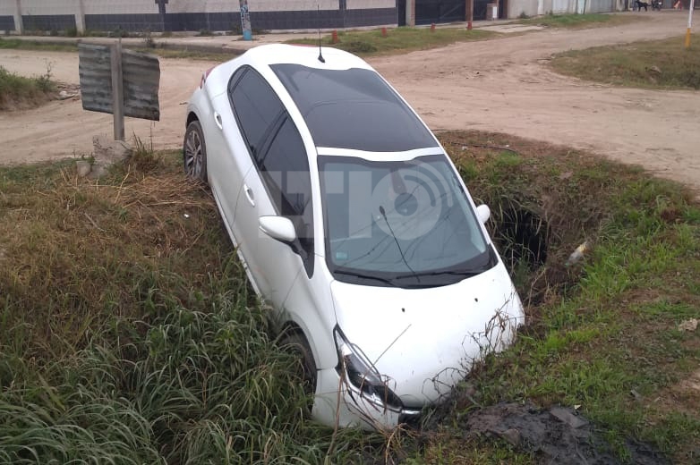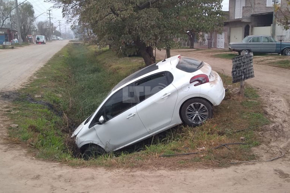 El hecho ocurrió en Callejón Aguirre al 5.000 cuando, por causas que se tratan de esclarecer, un Peugeot 208 de color blanco perdió el control y cayó dentro del zanjón que s encuentra en el medio de dos calles.
