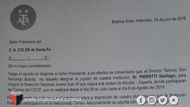 Argentina enfrentará la defensa del título del torneo de COTIF L'Alcúdia sub 18. El Seleccionado Nacional es campeón defensor, ya que logró la consagración en la edición 2018 de la mano de Lionel Scaloni. Para este certamen el futbol santafesino contará con representación, se trata de Santiago Pierotti, jugador de Colón que está haciendo sus primeras armas en la máxima división del fútbol argentino.