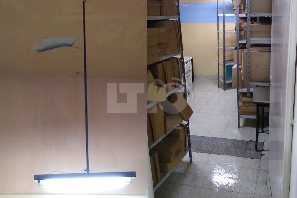 En el lugar, funciona la Dirección General de Higiene y Salud del Trabajador dependencia del Ministerio de Salud, y tras las precipitaciones de ayer, cedió parte del techo y se mojaron archivos y elementos de trabajo.