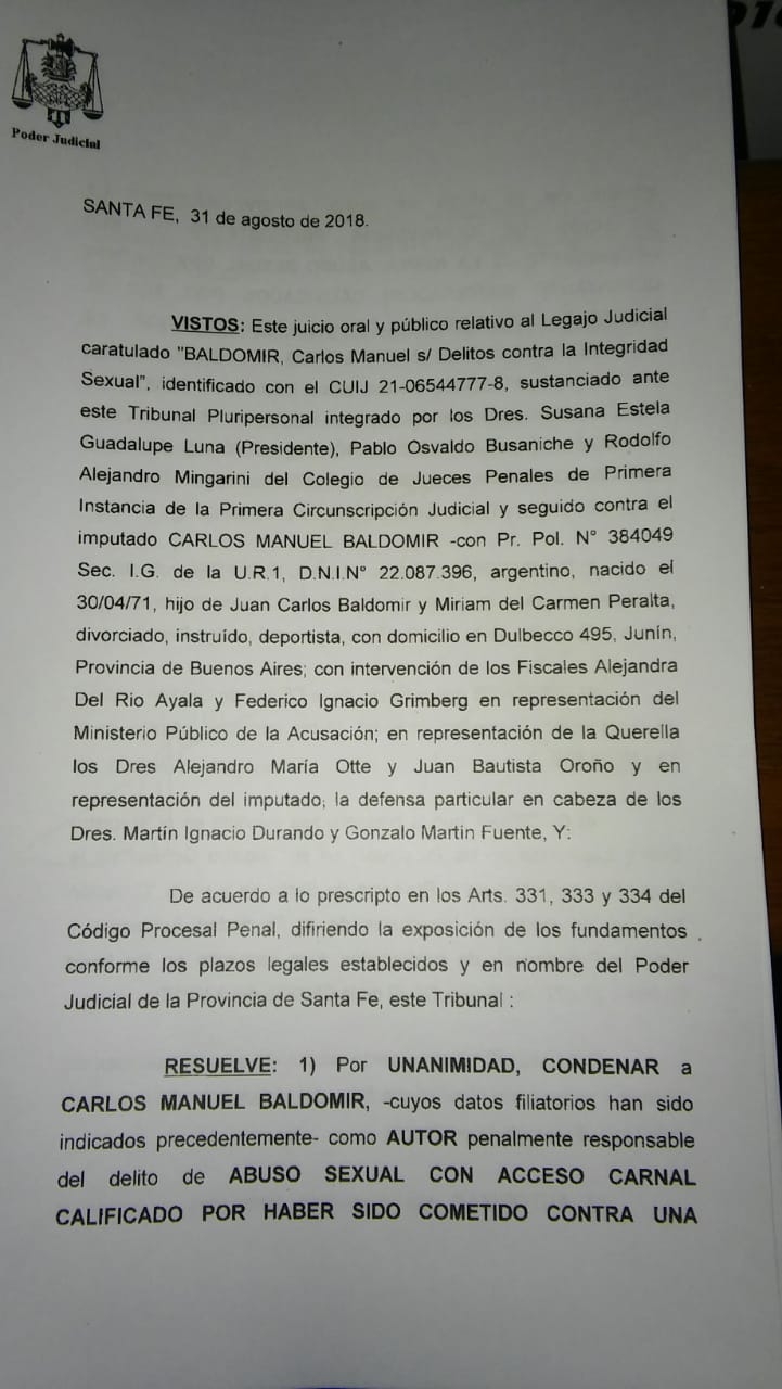 El tribunal presidido por la jueza Susana Luna acompañada por los jueces Rodolfo Mingarini y Pablo Busaniche, dio a conocer este miércoles la sentencia en el juicio ex boxeador santafesino Carlos “Tata” Baldomir (48) por el abuso sexual a su propia hija.