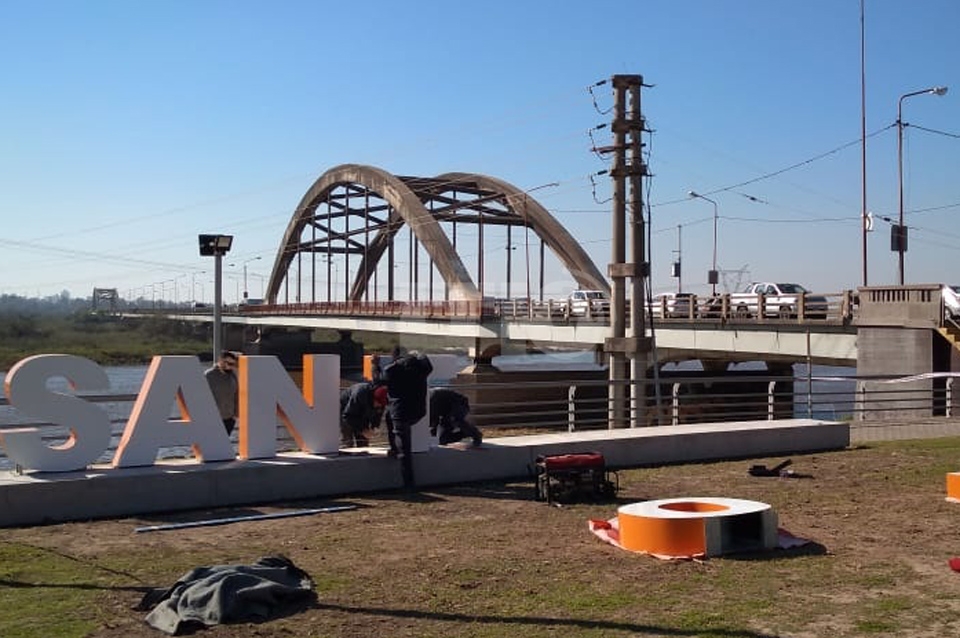 En la mañana de hoy un grupo de operarios trabaja en el ingreso a la ciudad de Santo Tomé en la colocación de un cartel con el nombre de la localidad. Las nuevas letras corpóreas están ubicadas en el estribo oeste al borde del río en la bajada del Puente Carretero que une esa ciudad con Santa Fe.