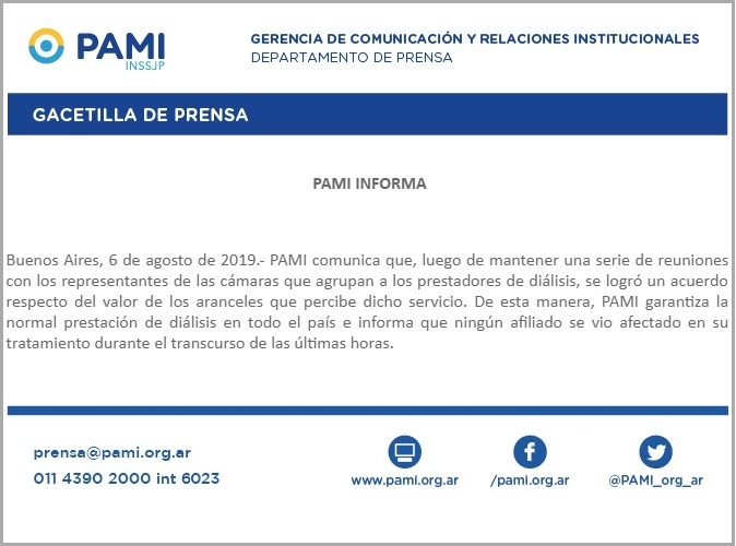 Según informó el Pami a través de un comunicado, al cabo de reuniones con los representantes de la cámara que agrupa al servicio de diálisis, se logró un acuerdo respecto al valor de los aranceles que percibe dicha prestación.