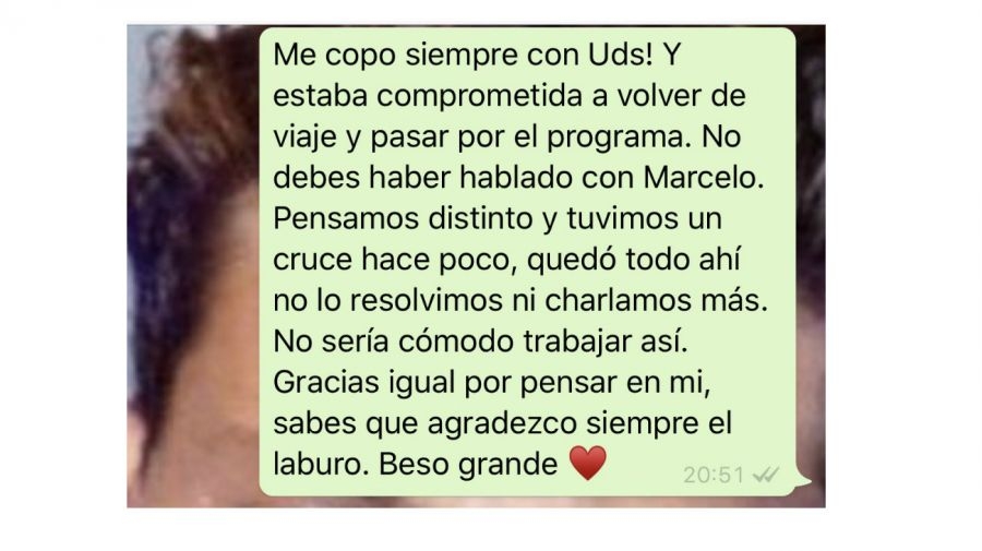“No debés haber hablado con Marcelo. Pensamos distinto y tuvimos un cruce hace poco, quedó todo ahí, no lo resolvimos ni charlamos nada más”, indicó la subcampeona del Bailando 2018, referenciando a su fuerte mensaje en contra del conductor cuando este expresó su deseo de tener a Daniel Osvaldo –su ex pareja y padre de su hijo- en la pista del certamen de El Trece a fines del mes de mayo. En ese entonces, la actriz le recordó que hacía pocos meses atrás, él estaba apoyando la lucha en contra de la violencia de género a través de un baile que realizaron en su programa.