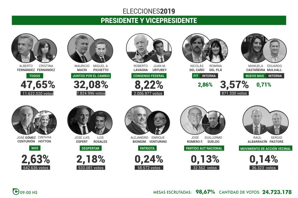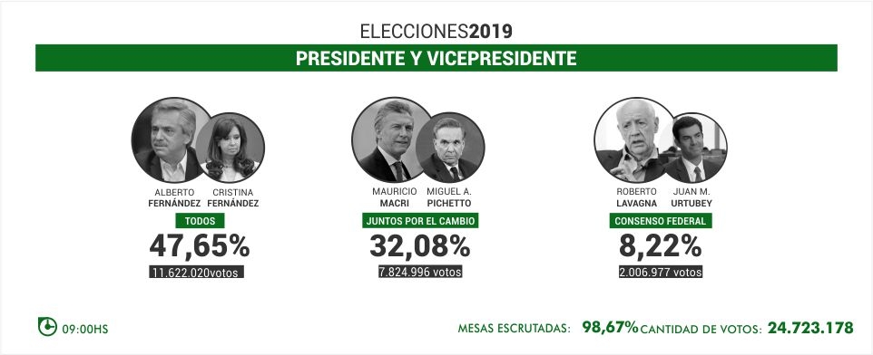 Con el 58 por ciento de las mesas escrutadas, la fórmula de Fernández y Cristina Kirchner obtenía el 47,01 por ciento de los votos, mientras que el binomio oficialista de Juntos por el Cambio que integran Macri y Miguel Pichetto obtenía el 32,66 por ciento.