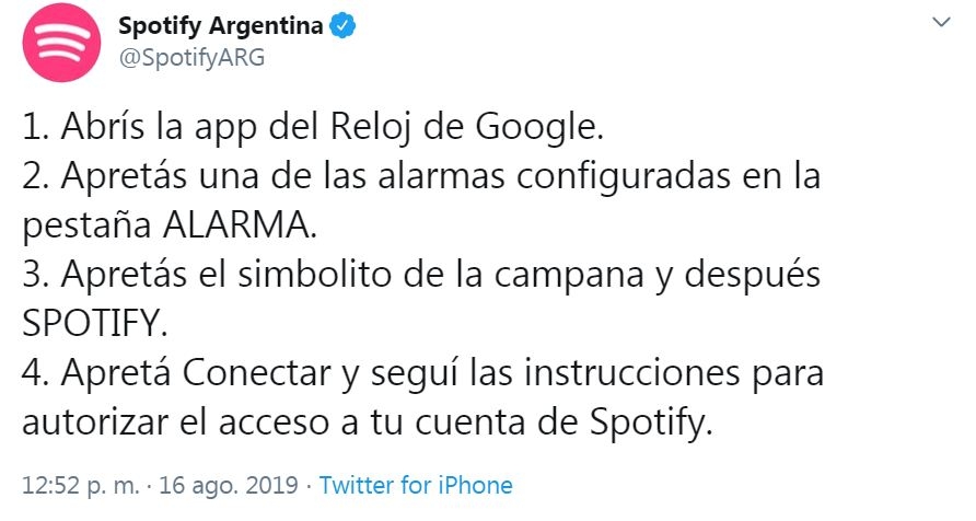 La aplicación de música Spotify reveló a través de su cuenta de Twitter cómo hacer para despertarte con "musiquita" por la mañana. Con un breve hilo, la cuenta argentina de la empresa sueca contó paso a paso cómo configurar la alarma para comenzar el día con canciones.