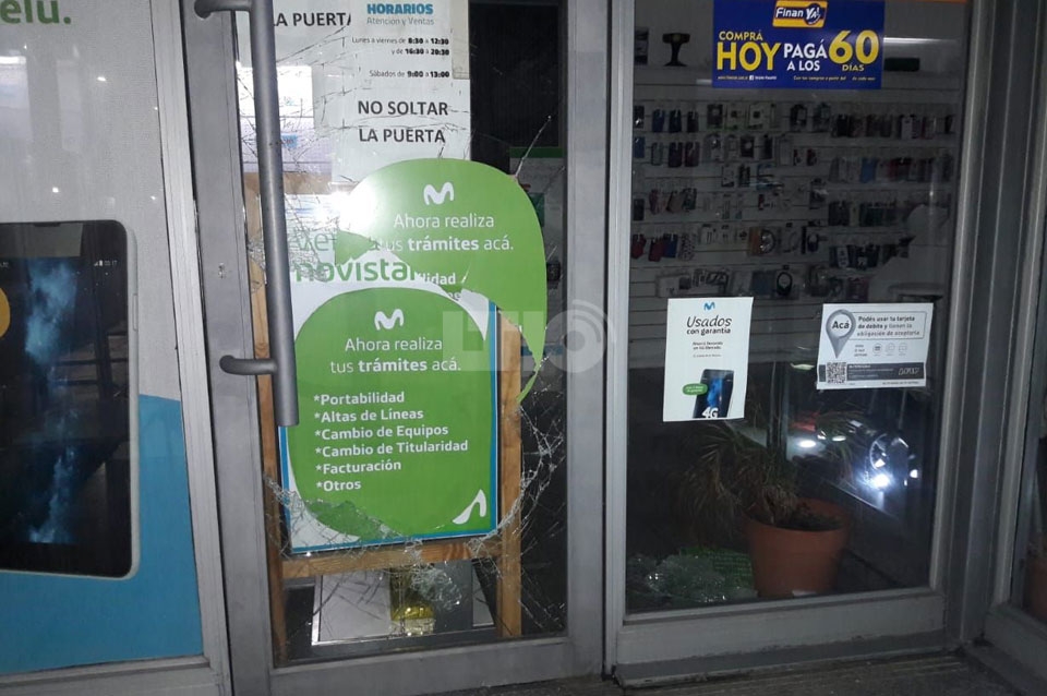 Más tarde, se pudo advertir sobre otro hecho de vandalismo en un local de Movistar en 25 de Mayo e Irigoyen Freyre. Al parecer, el o los delincuentes se llevaron varios equipos de telefonía celular que había en exhibición.