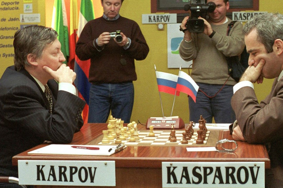Sus cinco duelos con Anatoly Karpov marcaron a fuego la historia del ajedrez mundial y todos fueron muy reñidos. En 1984, cuando perdía 5-3, el match se suspendió luego de 48 partidas por decisión de Florencio Campomanes, ex presidente de la FIDE. Fue en Moscú 1985 cuando destronó a Karpov al vencerlo por 13-11. Las tres defensas serían exitosas pero dramáticas por 12,5-11,5 (1986), 12-12 (1987) y 12,5-11,5 (1990).