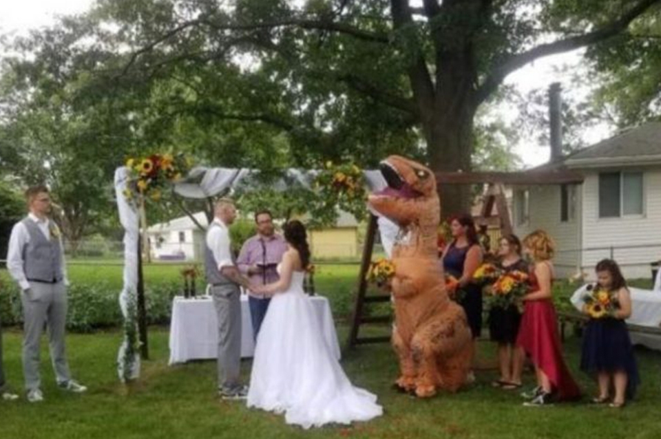 Una mujer estadounidense que estaba a punto de casarse le pidió a su hermana que oficie de dama de honor. Para esto, y para que no se sintiera presionada, le dijo que se vistiera como quisiera. La respuesta fue inesperada: la mujer fue vestida de dinosaurio. Las imágenes del momento fueron compartidas en las redes sociales de la protagonista y rápidamente se viralizaron. Los usuarios la bautizaron la "tiranodama".