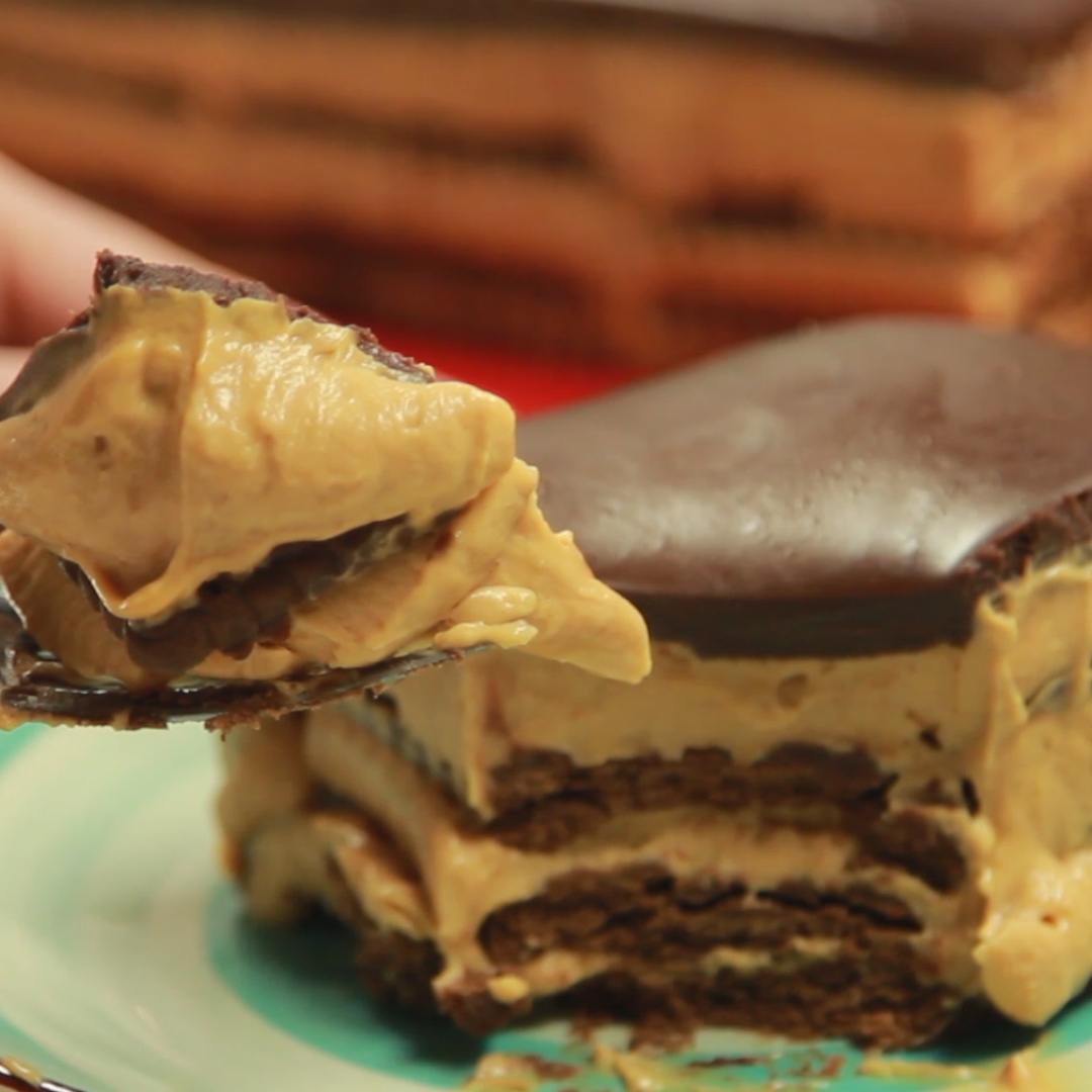 - Seguir alternando capas de galletitas hasta lograr cuatro capas, enfriar.