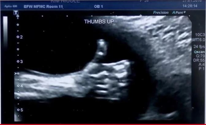 Nicole Kim, una madre canadiense, recibió un gran gesto de su tercer hijo, directamente desde la panza y antes de nacer: un pulgar arriba.