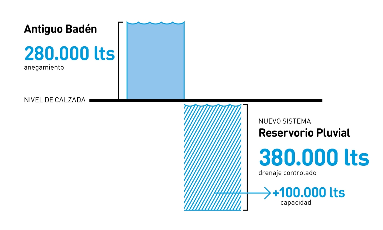 Los tres retardadores están diseñados para acumular en conjunto un volumen de 380 metros cúbicos, lo que equivale a 380.000 litros. “Antes, el badén acumulaba unos 280 m3, lo que implica que todo este sistema permite acumular 100 m3 más”, destacó Felipe Franco, y a continuación graficó: “La capacidad de todo el sistema es comparable a 380 tanques de agua de 1.000 litros, como los que hay en una casa; al líquido transportado por 76 camiones cisternas de 5.000 litros de capacidad, o algo más del volumen contenido en una pileta de 25 metros de largo”.
