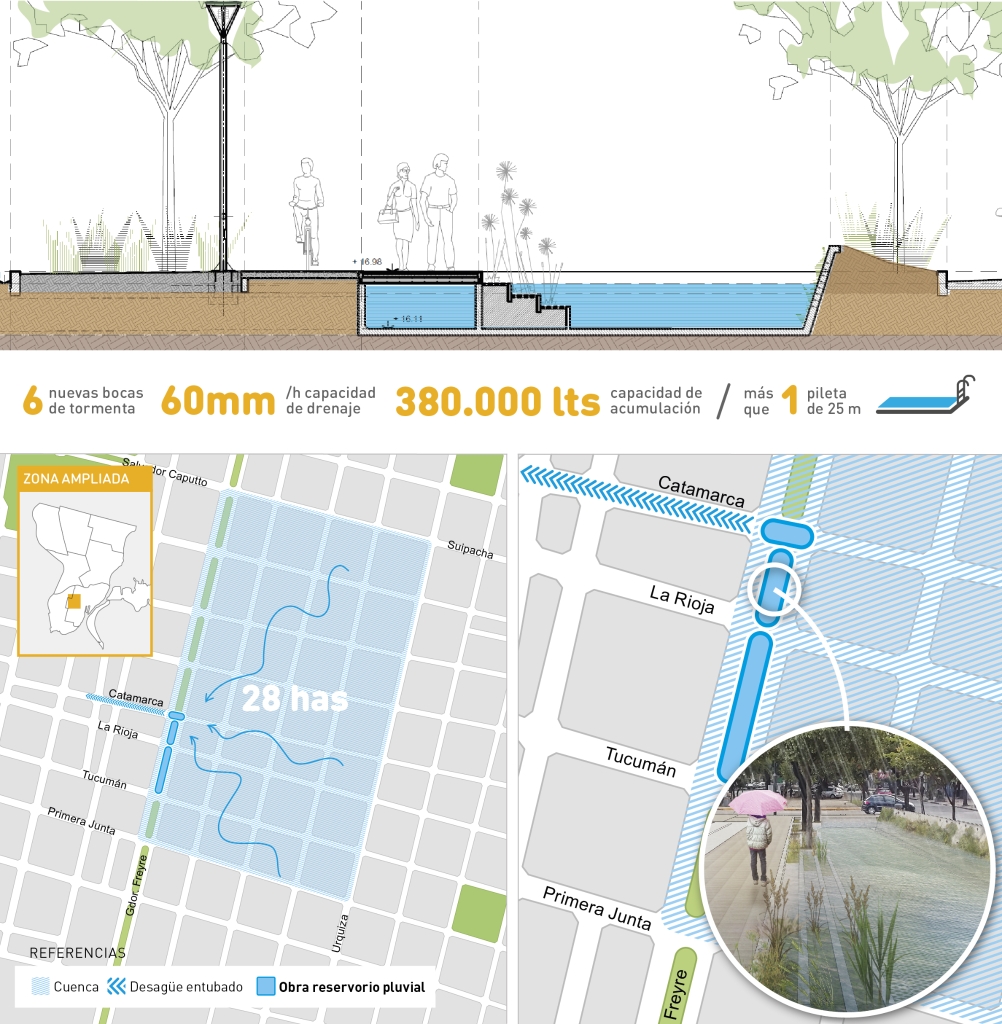 Todo el sistema está calculado según lo normado en la ordenanza 11959 sobre retardadores pluviales, que determina para el cálculo de estos contenedores tomar como referencia una lluvia de 60 mm/hora, considerada una lluvia fuerte. Según el Informe de lluvias, el pasado lunes la red de estaciones meteorológicas del Gobierno de la Ciudad registraron los siguientes registros pluviométricos: en el Palacio Municipal 61,25 mm; en Alto Verde 55,00 mm; en el CIC de Facundo Zuviría 62,75 mm y en el Hospital de Niños 55,75 mm. La intensidad máxima de lluvia fue de 69 mm/h y se produjo a las 2.45 horas.