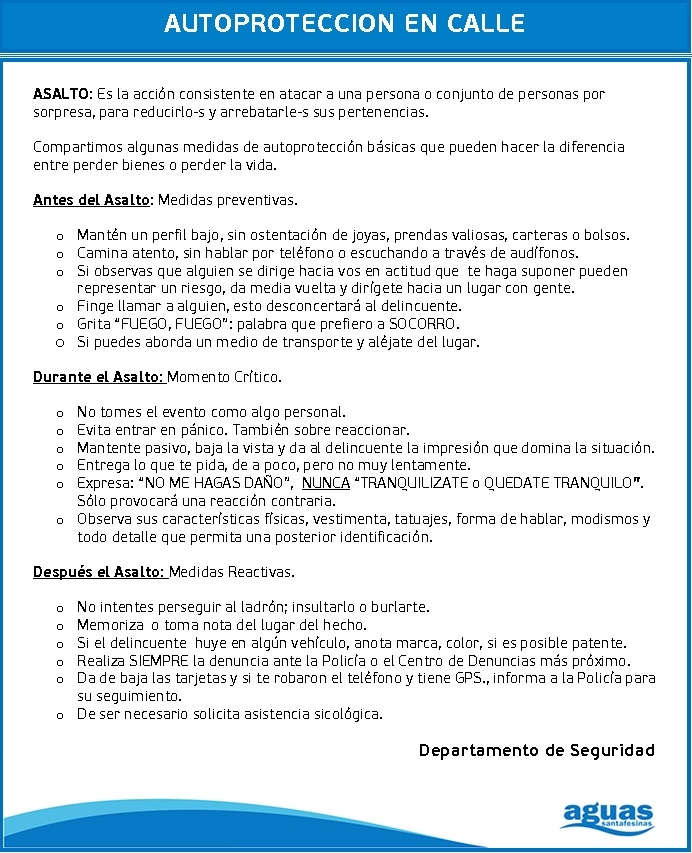 Ante la creciente ola de hechos delictivos, la empresa Aguas Santafesinas lanzó un instructivo con medidas de "autoprotección básica" a tener en cuenta en caso de sufrir asaltos en la calle, y está dividido en recomendaciones para tres momentos claves: antes, durante y después de un robo.