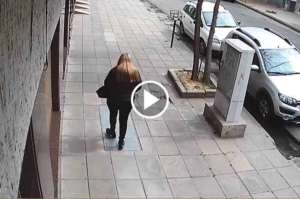 El video de las cámaras de seguridad de la zona muestran la manera en que el malviviente le arranca el bolso tirando a la mujer al piso, quien golpea su cara fuertemente contra la vereda.