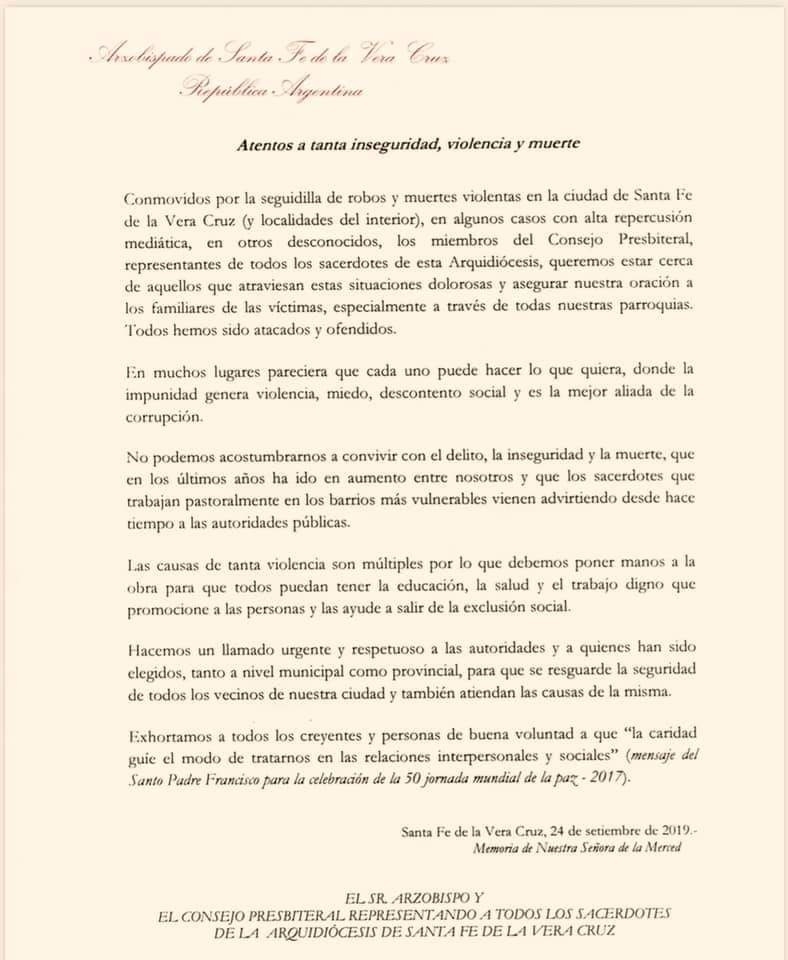 Por ello, el máximo referente eclesiástico de Santa Fe hace un "llamado urgente y respetuoso" en el documento "a las autoridades y a quienes han sido elegidos, tanto a nivel municipal como provincial, para que se resguarde la seguridad de todos los vecinos de nuestra ciudad y también atiendan las causas de la misma".