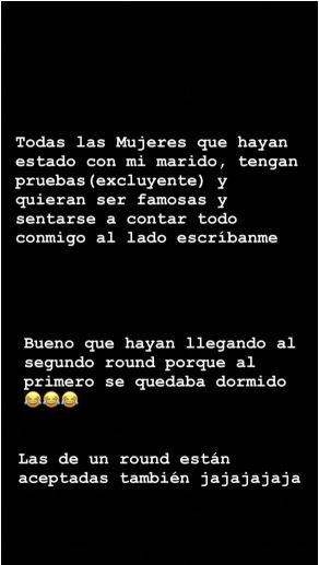 “Todas las mujeres que hayan estado con mi marido, tengan pruebas (excluyente) y quieran ser famosas y sentarse a contar todo conmigo al lado, escríbanme”, puso Mariana en las Stories de su flamante red social. “Bueno, que hayan llegado al segundo round porque al primero se quedaba dormido”, siguió, picantísima para terminar rematando con un “las de un round están aceptadas también ja, ja, ja”.