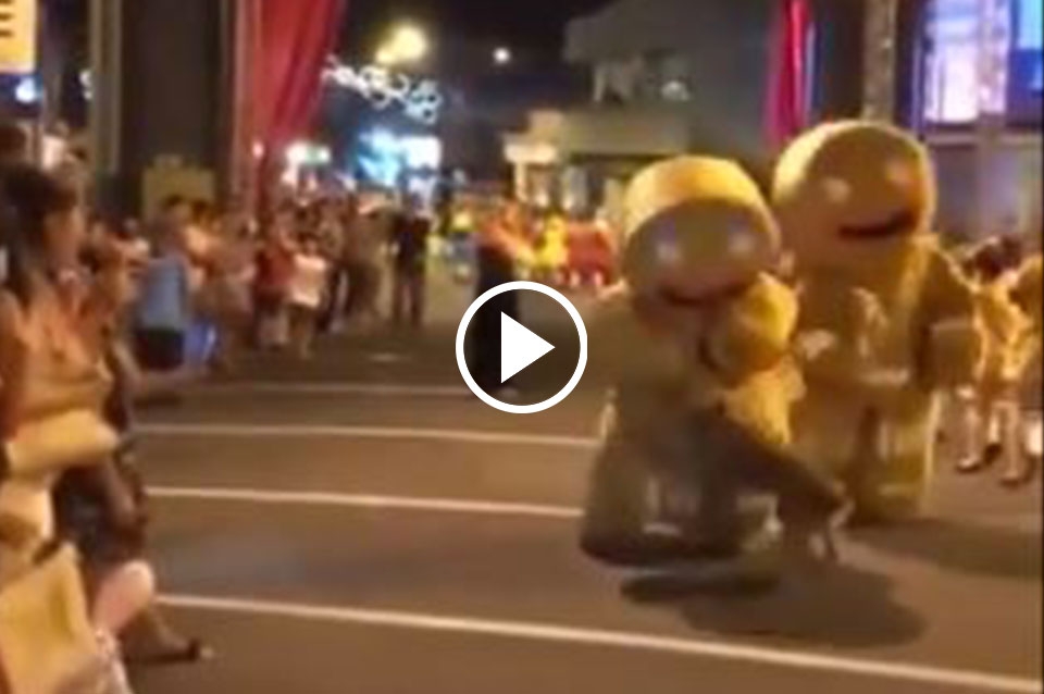 Un nuevo video viral circula por las redes sociales: se trata de un vendedor disfrazado de galleta de jengibre que fue sorprendido por el ataque de un perro, por suerte el resto de sus compañeros "galletas" estaban para defenderlo.