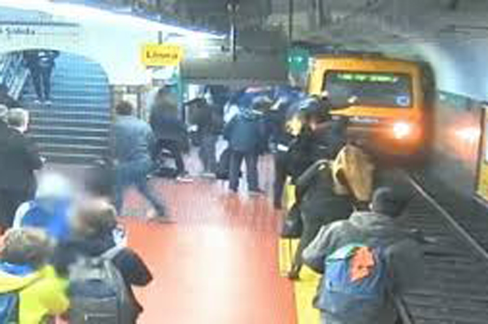 El hecho quedó registrado en las cámaras de seguridad de la estación donde se puede ver al hombre apoyado contra una columna cuando de pronto se desmaya y se desploma en el suelo, empujando con mucha fuerza a la mujer que caminaba por al lado suyo en el andén.