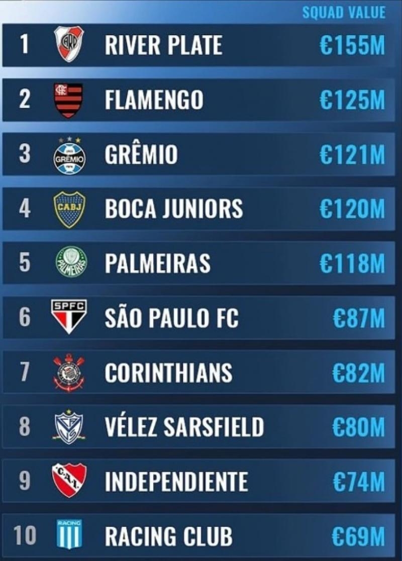 El listado es encabezado por River, vigente campeón de la Copa Libertadores y semifinalista de la actual edición del certamen. Según el portal, la tasación del elenco de Marcelo Gallardo es de 155 millones de euros.
