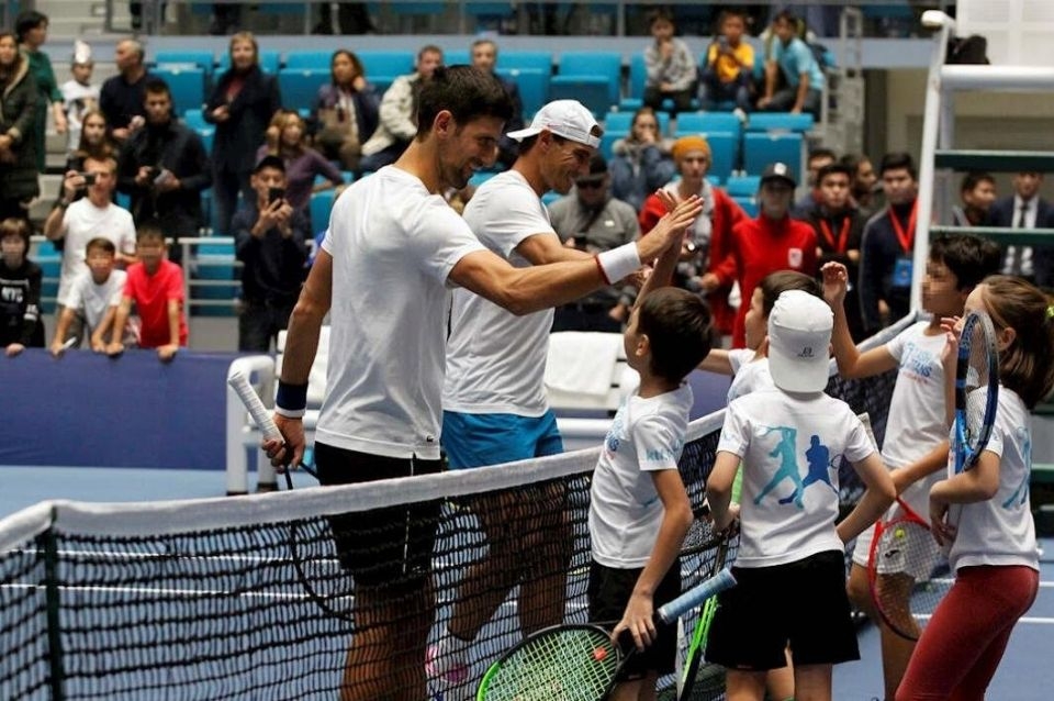 Nadal y Djokovic, que jugarán un partido en beneficio de niños y adolescentes desfavorecidos, asistieron a la ceremonia inaugural en calidad de invitados de honor junto con el presidente de la Federación de Tenis de Kazajistán, Bulat Utemuratov.