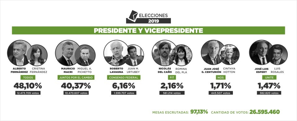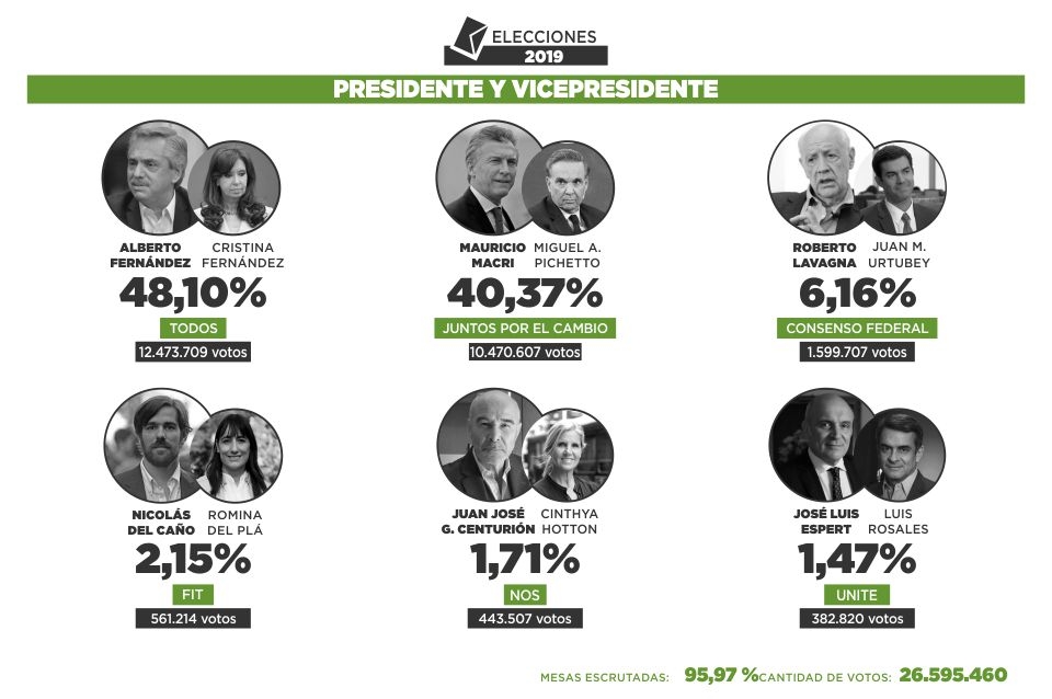 Con el 95,97 por ciento de las mesas escrutadas, la fórmula del Frente de Todos que integran Fernández y la ex presidenta Cristina Kirchner se prepara para asumir el Gobierno el 10 de diciembre y el mandatario, secundado por Miguel Pichetto en la boleta de Juntos por el Cambio, se despide de la aspiración a un segundo mandato.