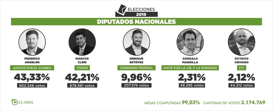 Marcos Cleri, Alejandra Obeid, Germán Martínez y Vanesa Massetani, por el Frente de Todos. Mientras que la última banca, hasta ahora, la conseguiría Enrique Estévez, por Consenso Federal.