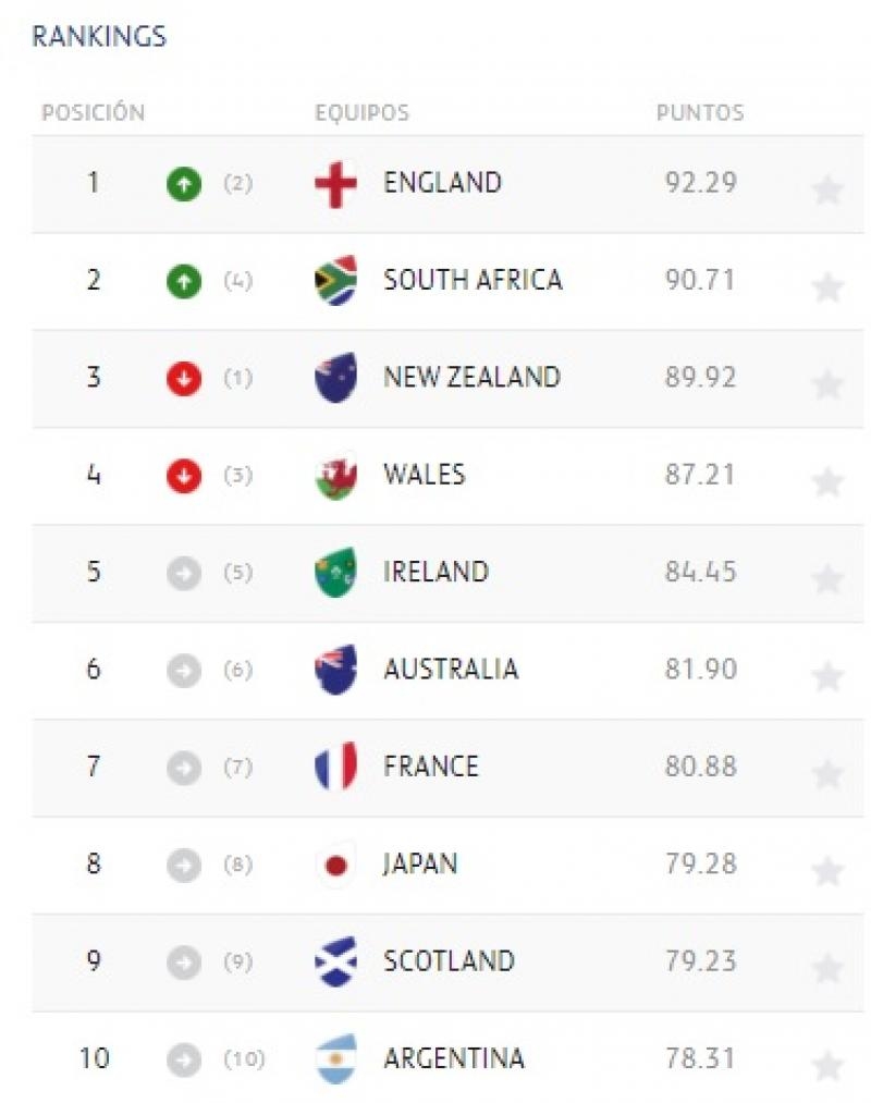 Luego de disputarse las semifinales de la Copa del Mundo en Japón, el ranking de World Rugby sufrió modificaciones. La nota ya la había dado Inglaterra el sábado, con el histórico triunfo sobre los All Blacks, para pasar al primer puesto del escalafón.