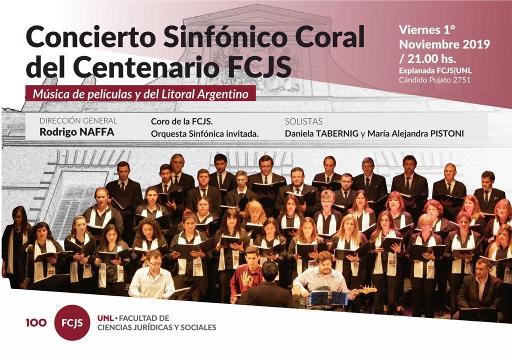 El viernes 1 de noviembre de 2019 se presentará el Coro de la Facultad de Ciencias Jurídicas y Sociales (FCJS) de la Universidad Nacional del Litoral (UNL), con un Concierto Sinfónico Coral del Centenario, en el que interpretará música de películas y del litoral argentino.