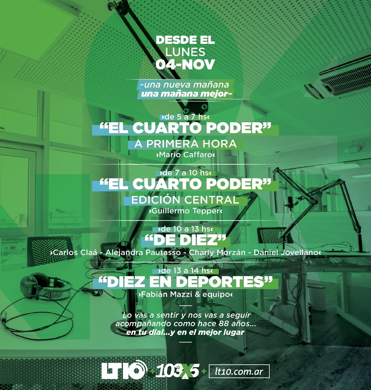 Desde las 10 y hasta las 13, la mañana se renueva con cambios significativos en busca de nuevos horizontes sonoros y periodísticos. “De Diez” es el nuevo programa que estará en el horario central de la emisora. Alejandra Pautasso, Daniel Jovellano, Charly Morzán y Carlos Claá propondrán una mañana divertida y distendida sin dejar de lado la rigurosidad periodística que caracteriza a LT10. El programa contará con la coordinación general de Aquiles Noseda