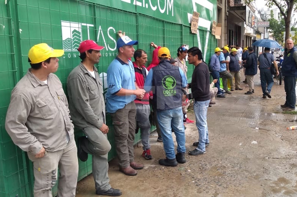 Un grupo de trabajadores de la construcción reclaman en la puerta de un obrador por falta de pago tras acuerdos realizados entre el gremio que los nuclea y la empresa contratista. El reclamo se da en un edificio en construcción ubicado en Bulevar al 2700 frente a la Universidad Nacional del Litoral. Durante la mañana hubo cortes de calles y reducción de calzada en la zona de manera periódicas.