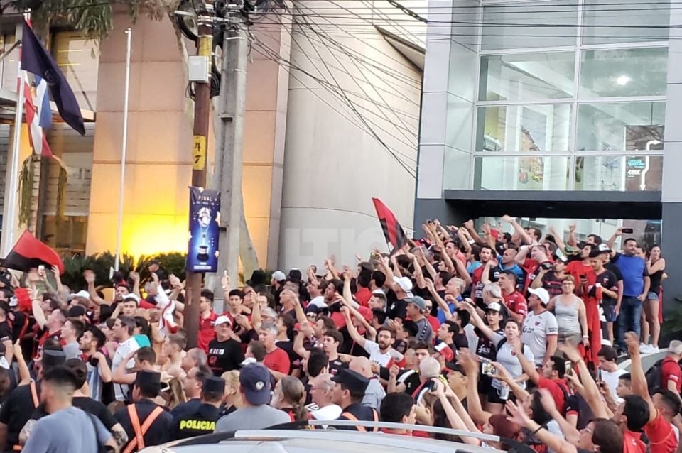 Justamente en la antesala del cotejo más importante de la historia, la gente se acercó hasta el hotel de concentración para brindarle un estruendoso apoyo. Los tradicionales cánticos, banderas y bengalas fueron algo que distinguió y sacudió la escena.