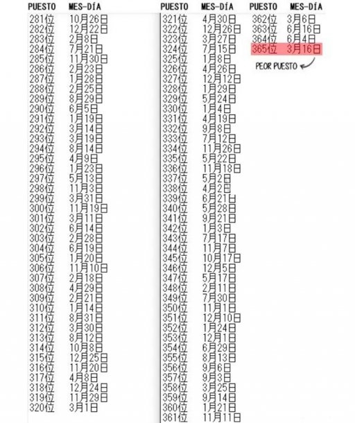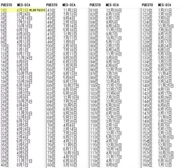 Por ejemplo, según indica la tabla para el próximo año, los nacido el 1º de abril serán los más afortunados en tanto que aquellos que cumplen años el 16 de marzo serán los más desafortunados. Mientras más cerca se encuentre tu día de nacimiento del número 1 de la tabla, mejor será el augurio para el 2020.