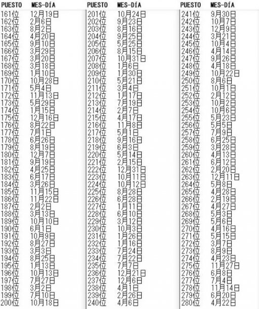 Simplemente hay que buscar la fecha de nacimiento (mes y día) y fijarse en el puesto en el que está. Si se encuentra cerca del 1, la predicción es que 2020 será un año con mucha suerte. Sino, uno sin tanta fortuna.