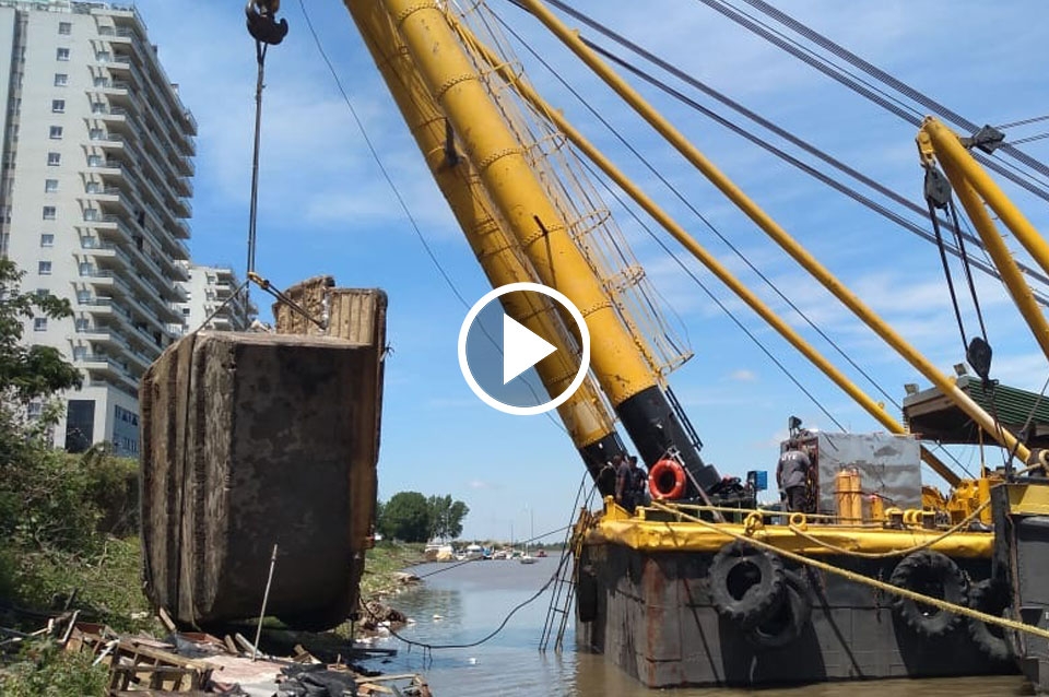 Si bien algunas partes de la casa ya se habían retirado -a la orilla del río pueden observarse el balcón y el contrapiso-, hoy se culminaban las tareas con la parte más difícil: la remoción del pontón, una plataforma flotante de hormigón de 50 a 60 toneladas.