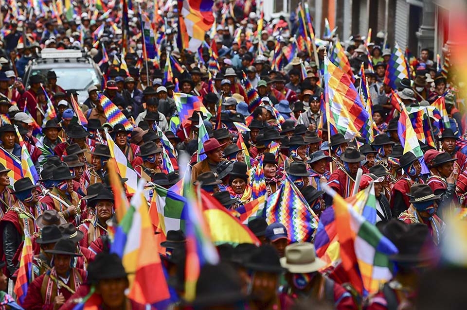 Las columnas de federaciones campesinas, docentes rurales y grupos de juntas vecinales avanzaban a veces corriendo, a veces caminando a lo largo de la avenida Mariscal Santa Cruz, desde el obelisco hasta la plaza mayor de San Francisco, siempre vigiladas de cerca por los cordones de policías y soldados que garantizaban el perímetro sur de la zona de plaza Murillo, donde están los principales edificios del Estado nacional.