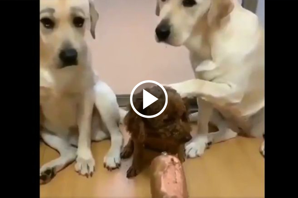 En las redes sociales fue comentada hasta el cansancio la filmación que involucró a cuatro perros: tres mayores y un cachorro, al que terminaron mandando al frente.