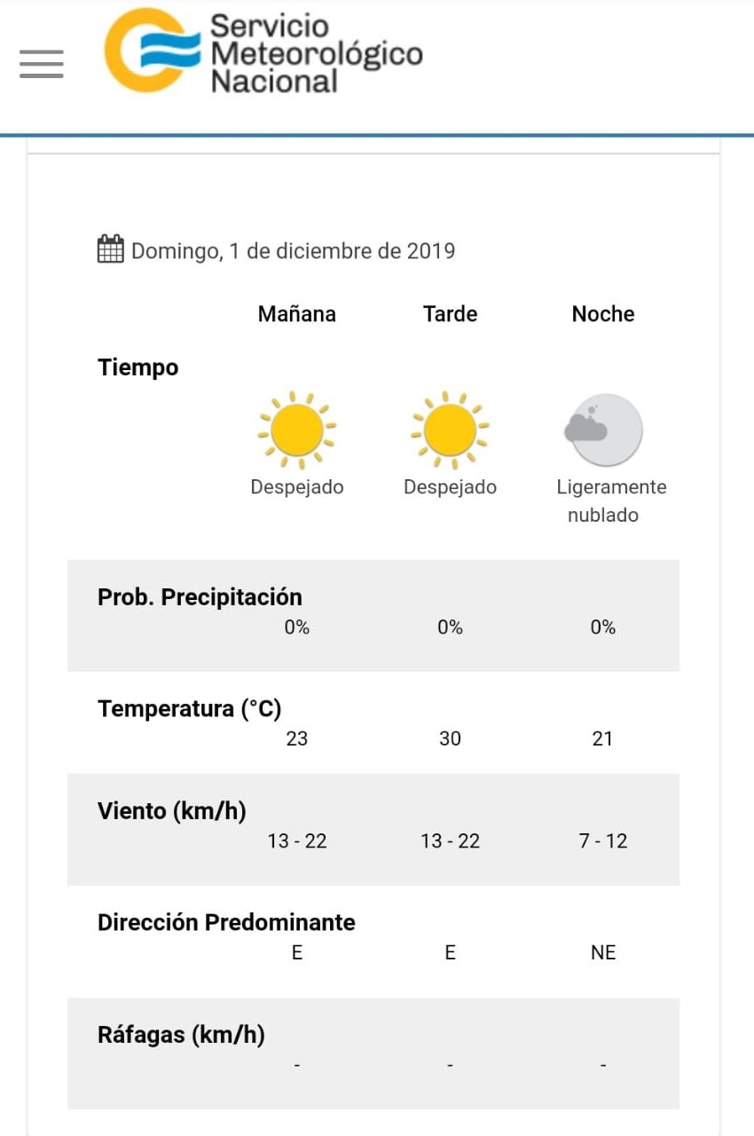 El Servicio Meteorológico Nacional anuncia una jornada con cielo despejado y a puro sol para este domingo. La temperatura máxima rondará los 30 grados en la presente jornada.