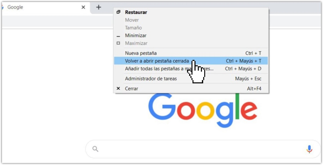 En este menú, dependiendo del navegador que estemos usando, la opción para volver a abrir una pestaña cerrada tendrá diferentes nombres: Volver a abrir pestaña cerrada, Reabrir última pestaña cerrada o Deshacer el cierre de la última pestaña, por ejemplo. Pese a las diferentes frases, la opción es la misma. Hacemos clic sobre ella y la última pestaña que cerramos volverá a ser abierta.