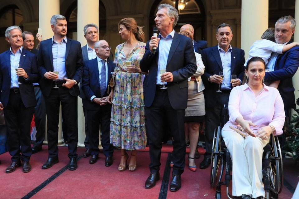 Con la copa en la mano y acompañado por la primera dama Juliana Awada, el mandatario dio un discurso ante los trabajadores de la Rosada, en el que les agradeció por sus tareas en estos cuatro años y destacó además las obras de remodelación y mantenimiento del histórico edificio que se realizaron bajo su gestión.