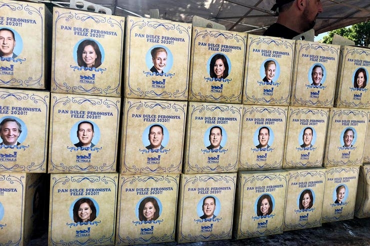 Dentro del merchandising del Frente de Todos, y en vísperas navideñas, en la Plaza de Mayo se vende el "Pan Dulce Peronista" junto al "Vino Compañero". El pan Dulce, que se consigue por 200 pesos, tiene cuatro imágenes en la caja con las caras de Perón, Evita, Cristina y Néstor Kirchner, e invita a festejar el comienzo del 2020.