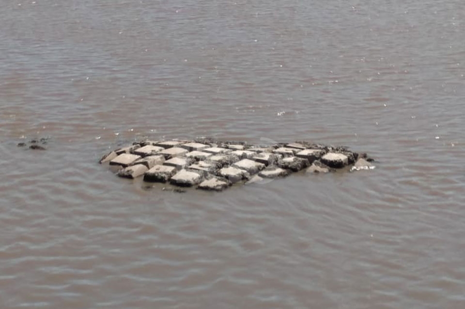 Ahora, otra imagen similar sorprendió a poca distancia de la costanera de Santo Tomé. A aproximadamente 10 metros del paseo inferior de la defensa, aparecieron bloques de hormigón, al oeste del Puente Carretero, por la pronunciada bajante del Río Salado, que está aproximadamente a 1,86 metros de altura.